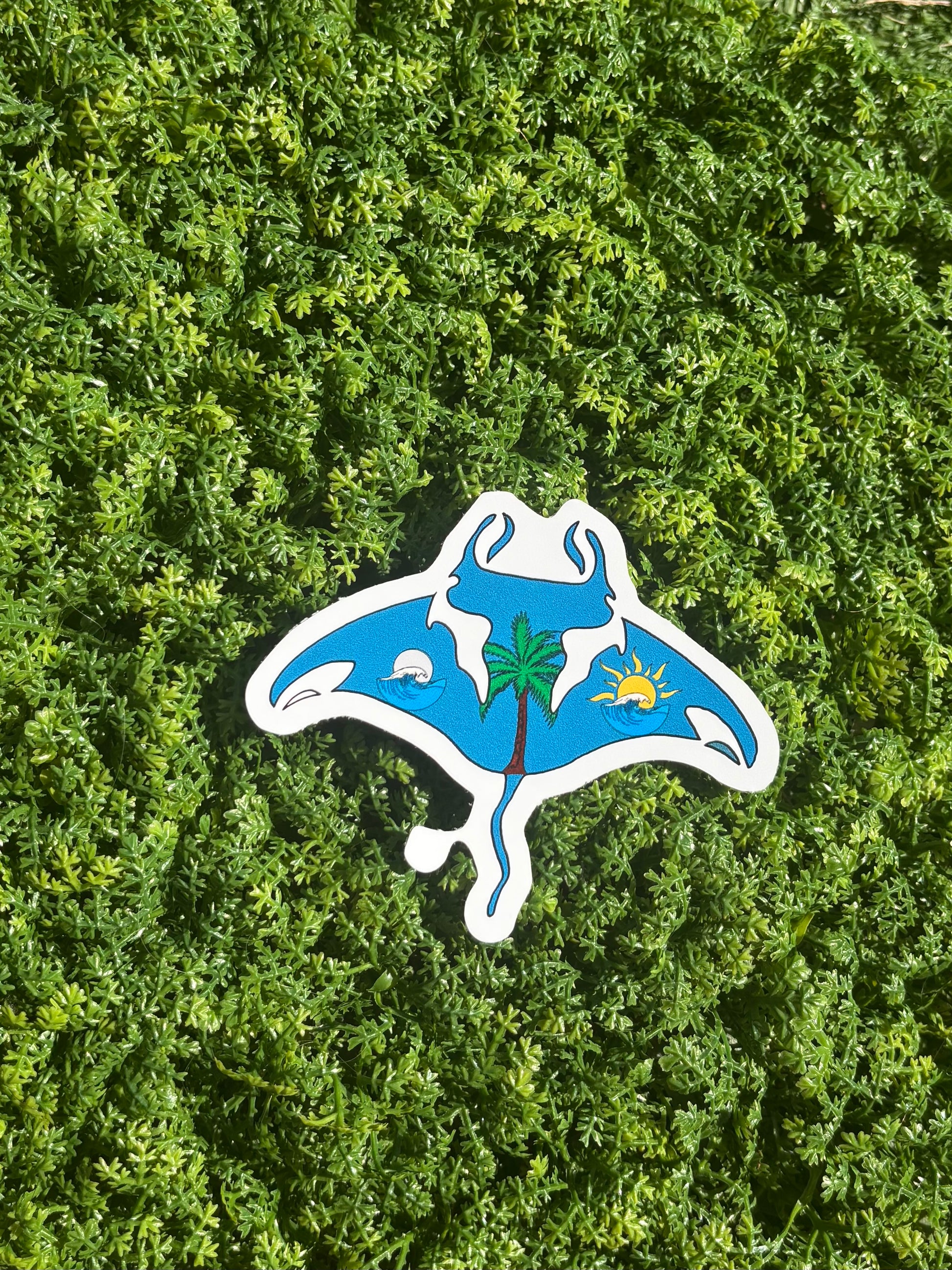 manta-ray sticker, with moon and waves on left side of fin. sun and waves on right side of fin. With a palm tree in the middle.